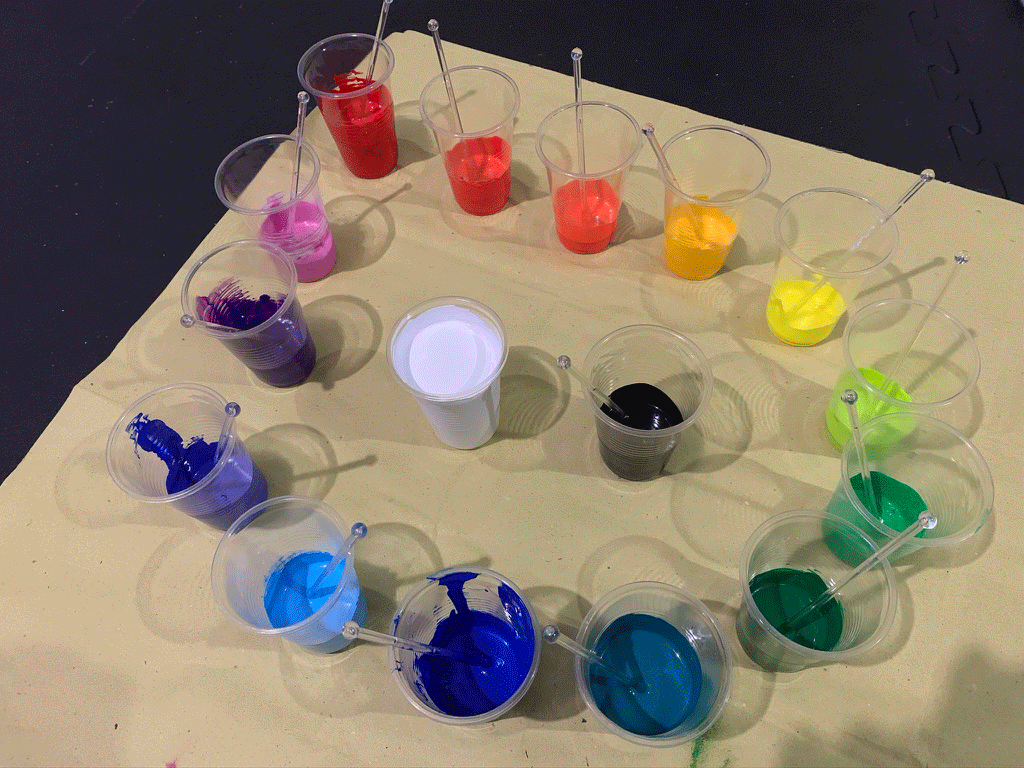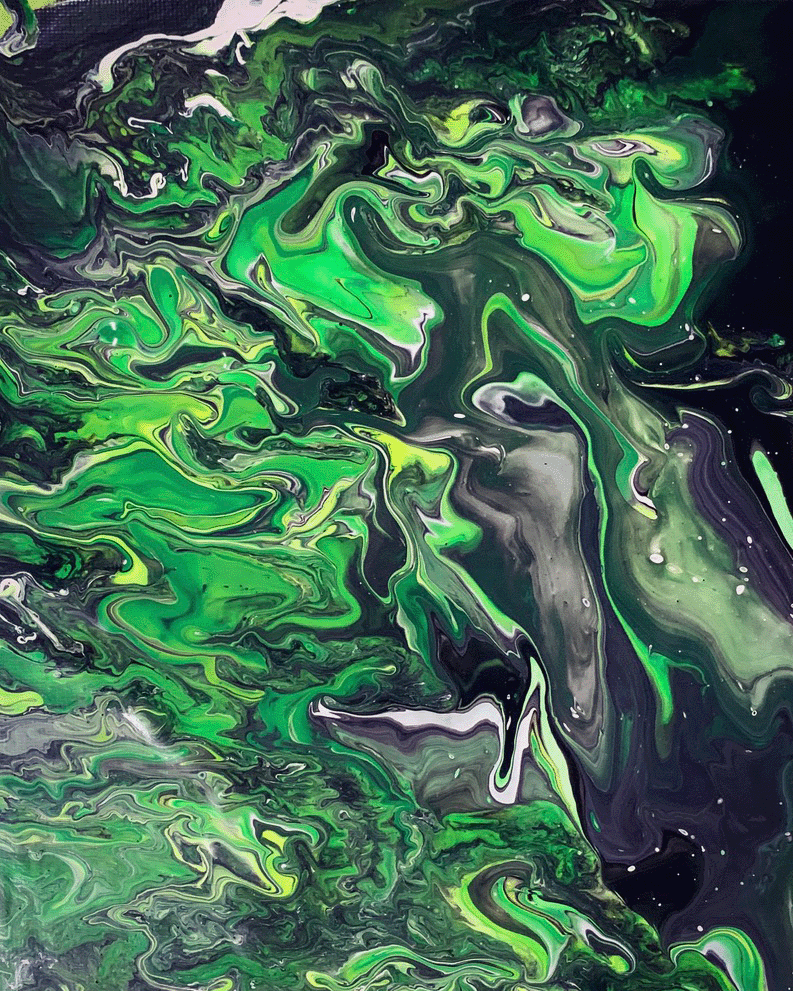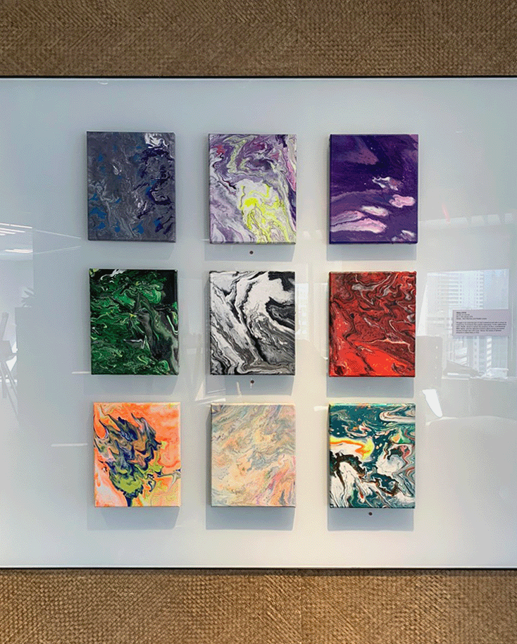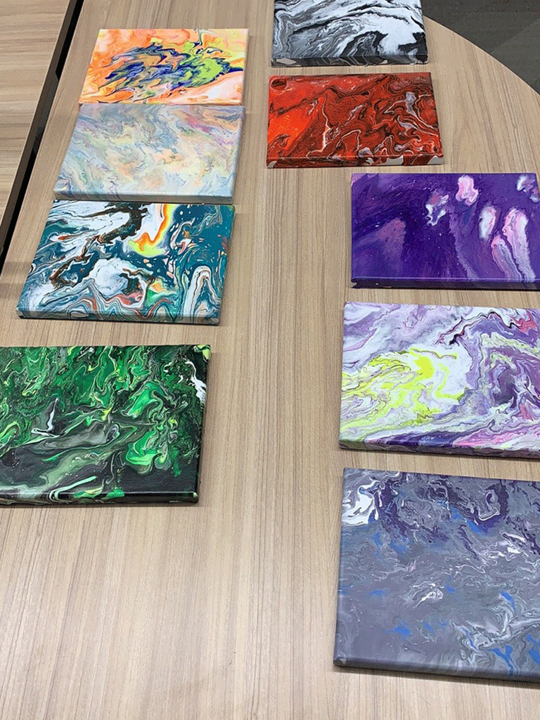 Originally the plan was to place 12 abstracts together, but there were acrylic pours that did not make the cut during curation. These pours were either too thick or too thin – and we learnt that the right mix is needed to make things flow freely.