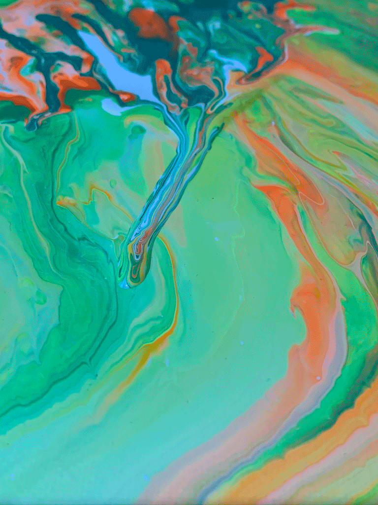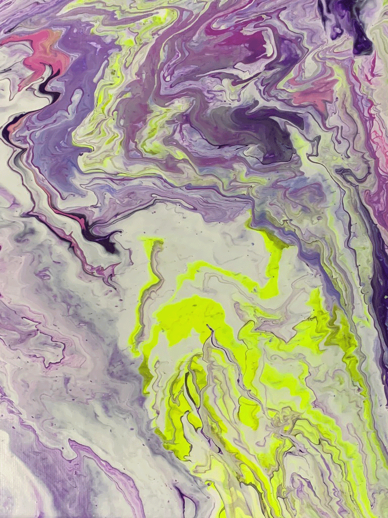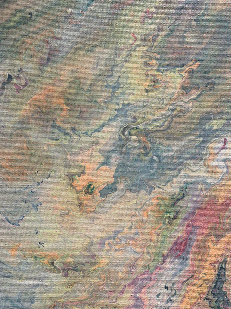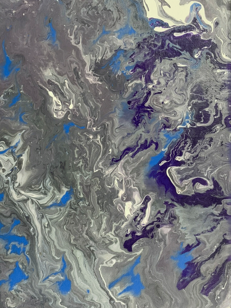 The colors were mixed in an empty cup with a combination of white formulation to make the paint flow freely. The outcome was a surprise after every pour – you cannot control how it will flow, but you can tilt the canvas to cover the white space.