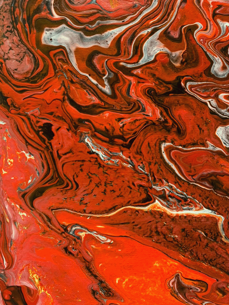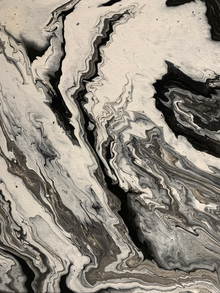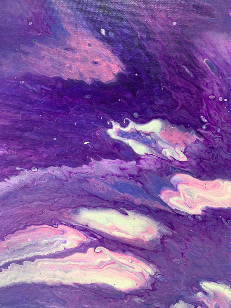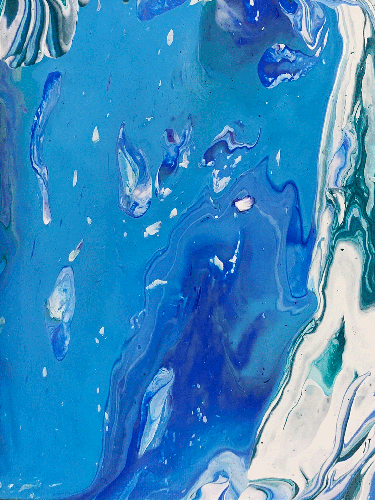 The colors were mixed in an empty cup with a combination of white formulation to make the paint flow freely. The outcome was a surprise after every pour – you cannot control how it will flow, but you can tilt the canvas to cover the white space.